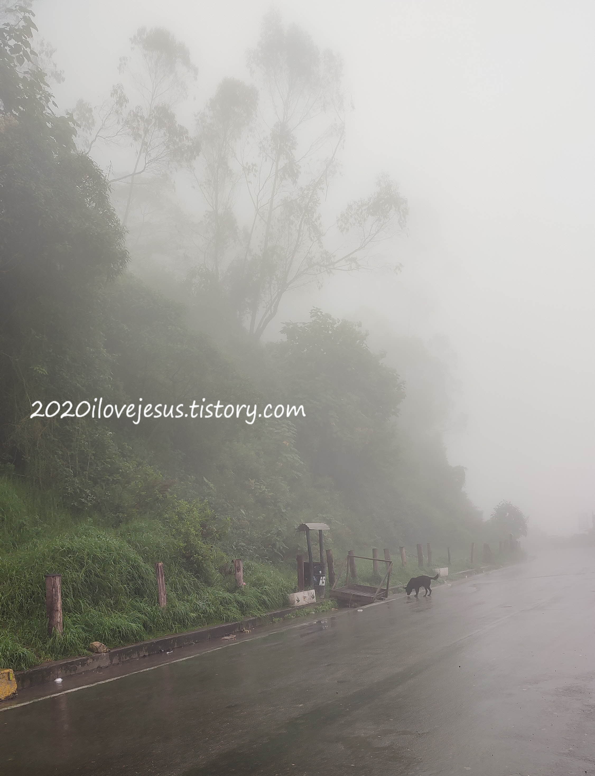 박물관에서 나와 건너편 버스 정류장에서 보고타행 버스를 기다립니다. 길 옆 식당은 비와 안개를 피하러 들어간 바이커들로 자리가 꽉 찼습니다. 주변에 개들이 많은데 가만 보니 식당에서 밥 먹고 길 건너 냇가에서 물 마시고, 다시 식당에 밥 먹으러 가네요. 똘똘이들입니다. 버스도 한참 가까이 와야 앞 유리에 적힌 글씨가 보일 만큼 안개가 짙습니다. 덕분에 버스도 여러 대 놓쳤는데 기사님이 손 흔드는 저를 못 보고 지나치거나 제가 버스를 못 보고 보낸 게 벌써 3대째입니다. 마침내 네 번째 온 버스를 타고 보고타로 갑니다.