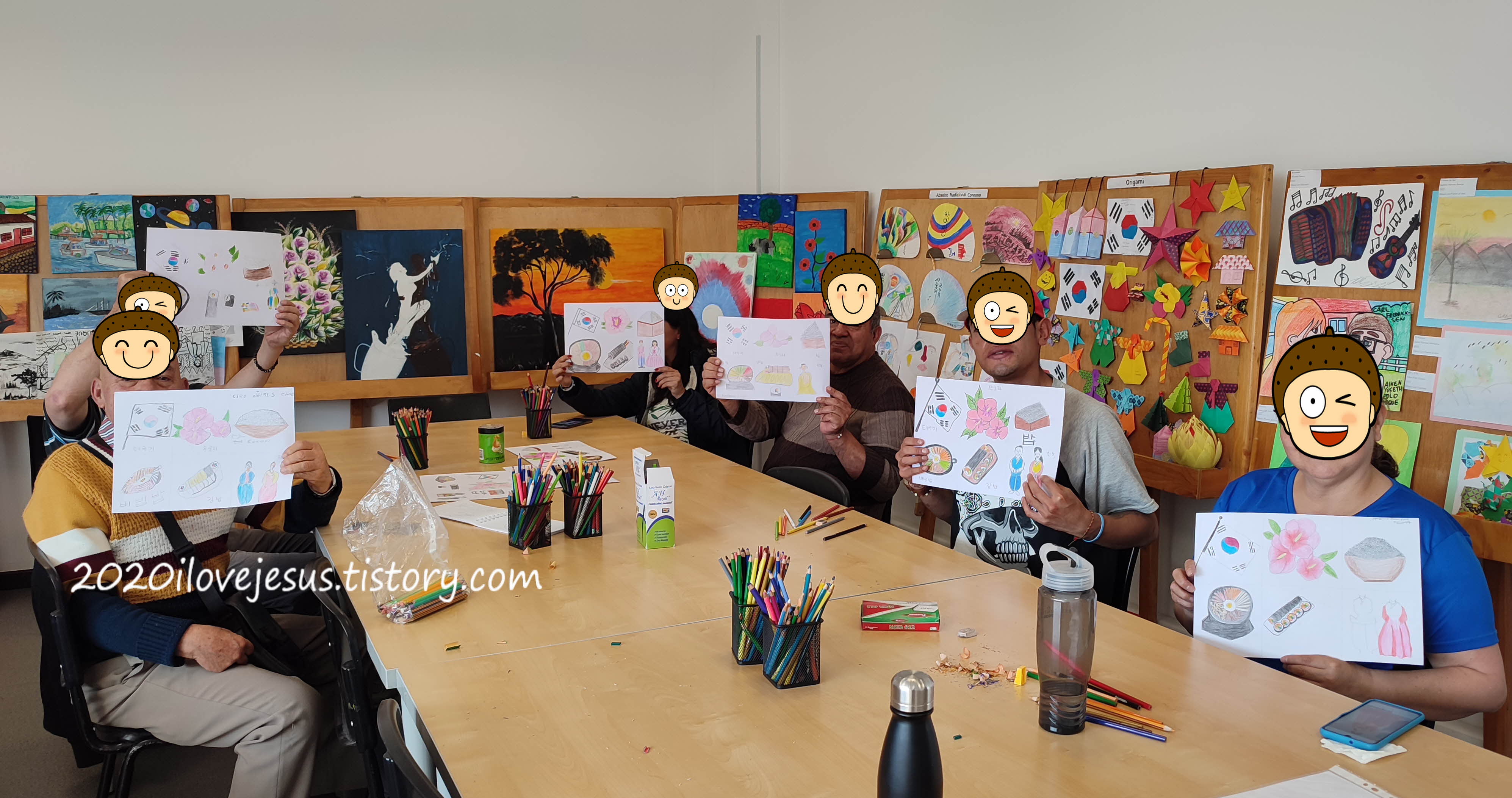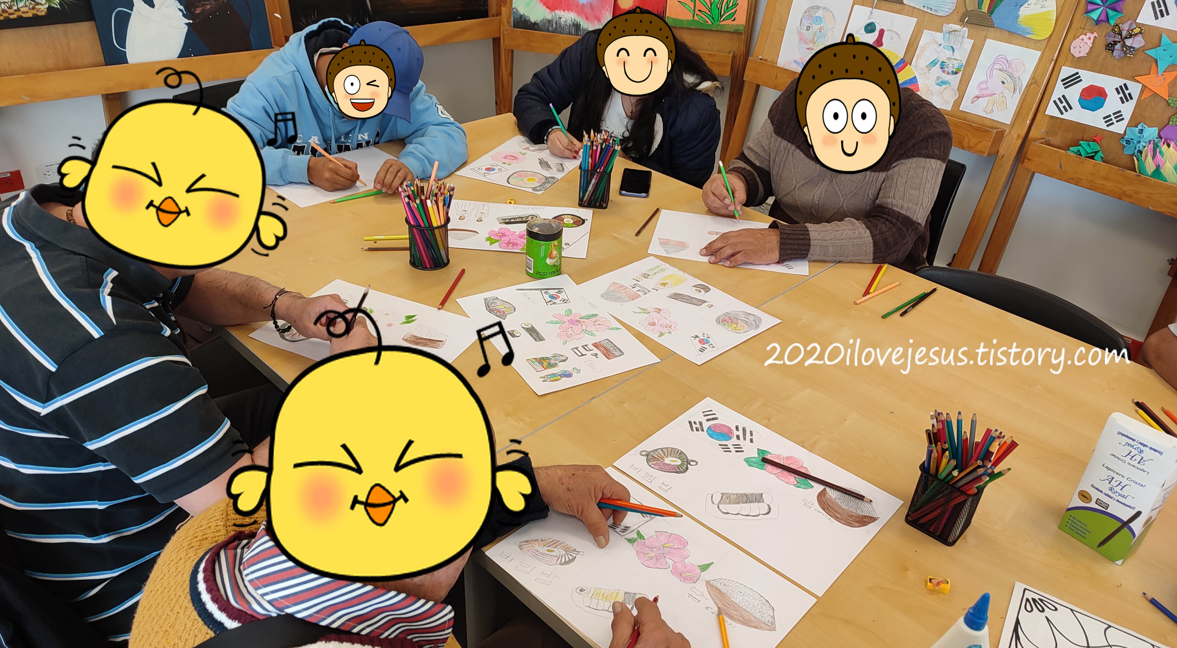 오후수업에 오신 분들은 지난 시간에 마무리 못한 한국 상징물 그리기를 합니다. 한국전통문화 수업을 하다 보면 일본과 우리나라의 것을 헷갈리는 분이 많습니다. 그래도 태극기, 한복, 비빔밥은 제가 하도 이야기를 해서 확실히 알고 계십니다. 김밥과 스시도 이번에 제대로 구분하시도록 스시는 싱싱한 생선을 이용하고 김밥은 주로 조리된 야채와 고기가 들어간다고 설명해 드립니다. 잘 이해하실지는 모르겠습니다. 김밥 먹고 싶네요.